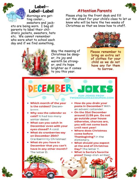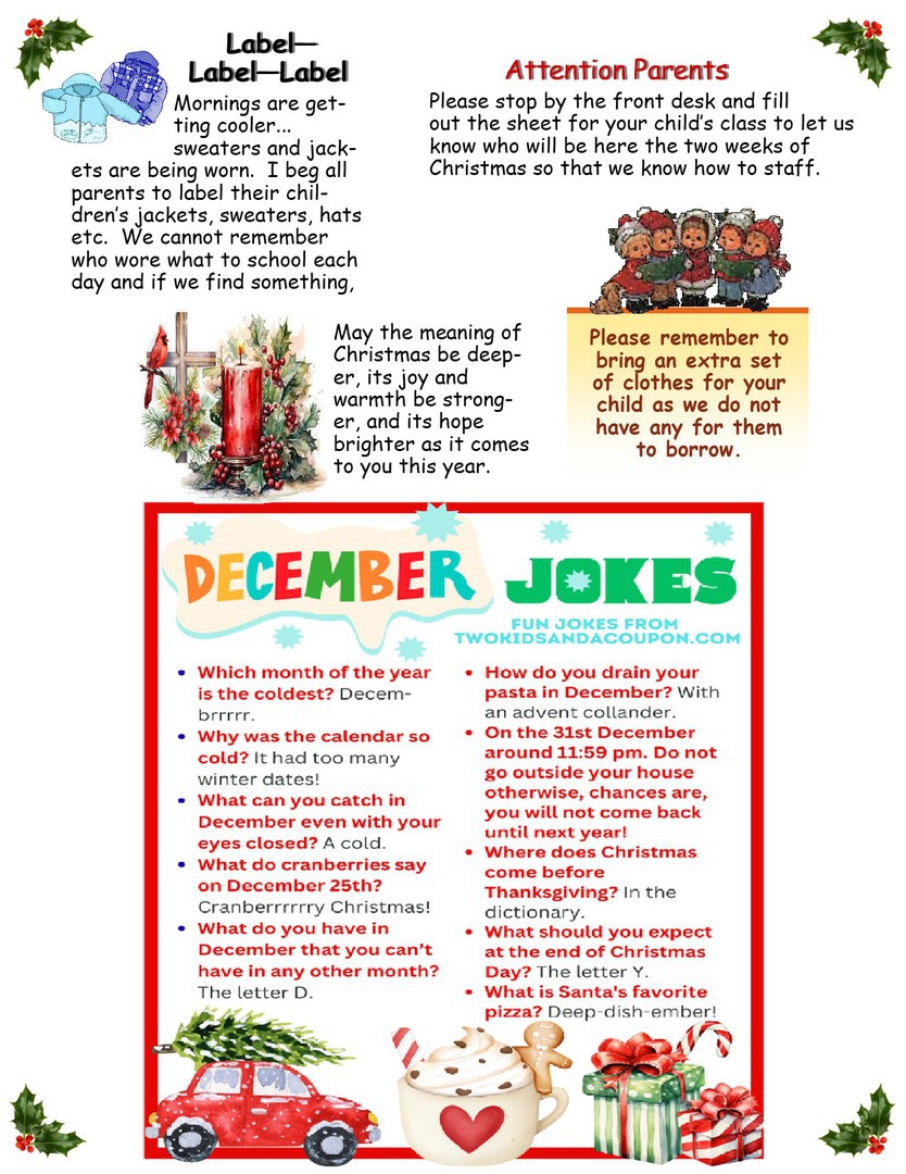 We have coat hooks outside the rooms that will acommodate a back pack and a winter coat. So we are requesting that all of our students bring a back pack with there personal belongings in it. We still have the cubbies but it will eliminate the overflow that we have. If your child brings a blanket and pillow...plese make sure that they are small ones. It is easier to put them in there cubbies. We appreciate your cooperation in this matter.